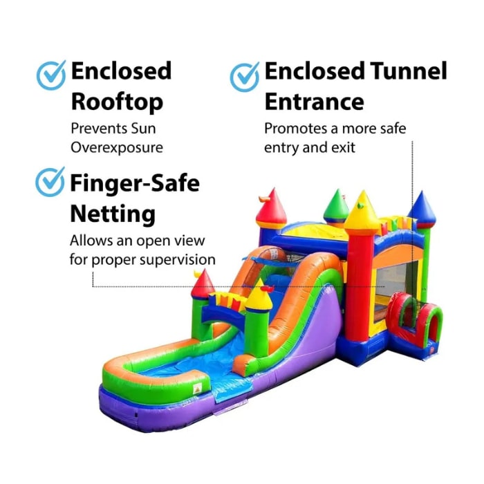 The ColorBurst Castle is a colorful, high-energy bounce house combo built to turn any event into a party. This 32 ft long, 15 ft wide, 15 ft tall unit combines a roomy bounce area, an attached slide that works wet or dry, and a splash pad (not a deep pool) for safe splash fun. It also features an indoor basketball hoop for extra action. Perfect for kids' birthdays, block parties, school events, and family gatherings. 🏰