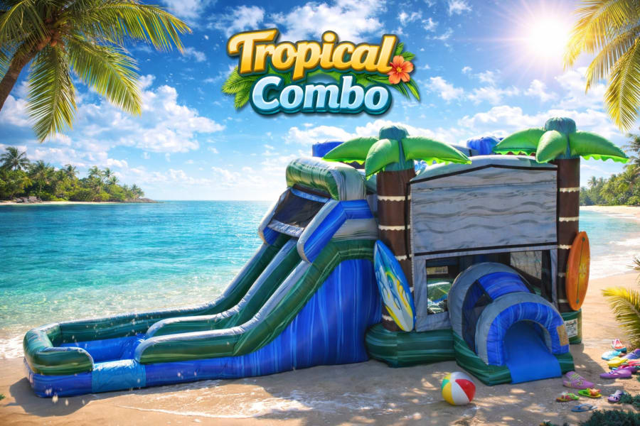 The Tropical Combo bounce house rental brings laid-back island vibes and high-energy fun to parties and events across Clarksville, TN. With palm tree accents, cool blue and green tones, and a beach-inspired design, this inflatable instantly turns any backyard into a mini vacation spot. The roomy bounce area features an inflated basketball hoop inside, giving kids an extra way to stay active before heading toward the dual-lane slides for a side-by-side race to the splash zone. The Tropical Combo can be used wet with the attached pool to beat the Tennessee heat or dry for year-round celebrations. Its balanced layout makes it a great fit for birthdays, school events, church gatherings, and neighborhood parties throughout the Clarksville area. Every unit is thoroughly cleaned and sanitized before delivery, and our crew arrives on schedule, sets everything up efficiently, and handles your property with professionalism and care from start to finish for a smooth, stress-free rental experience.