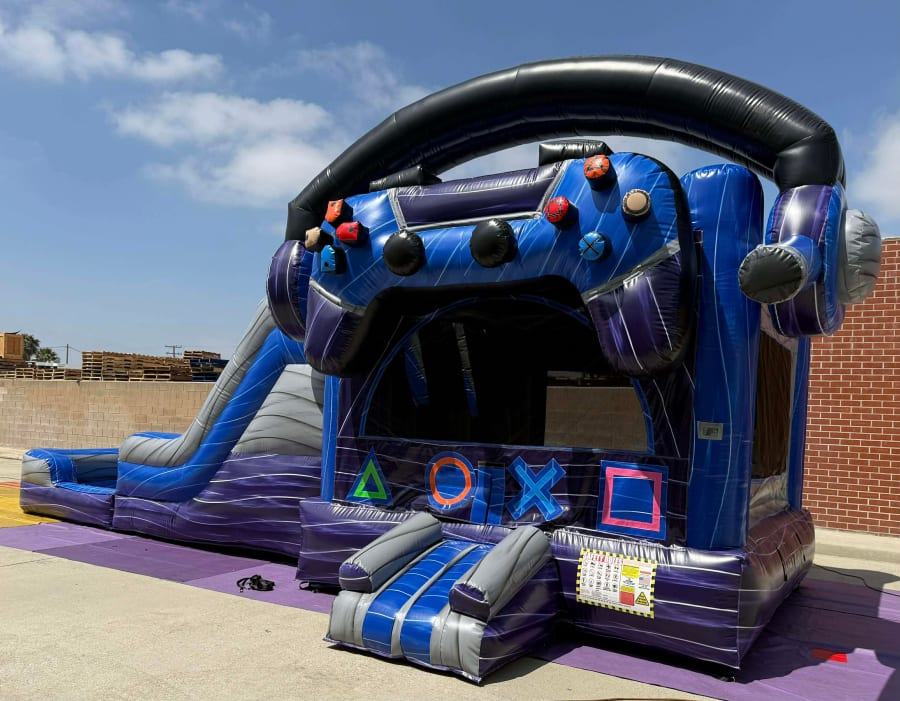 The Game Over combo bounce house rental brings next-level excitement to parties and events across Clarksville, TN. Stretching an impressive 32 feet long, 13 feet wide, and standing 15 feet tall, this large combo unit delivers serious wow-factor while still fitting comfortably in most yards. The spacious bounce area includes an inflated basketball hoop inside for interactive fun, and the attached dual-lane slides let riders race side-by-side for nonstop action. This combo can be used wet or dry, making it perfect for summer water parties with the splash pool or cooler-weather celebrations without water. Its bold gaming-inspired design makes it a hit for birthday parties, school events, church gatherings, and backyard celebrations throughout the Clarksville area. As with all of our inflatable rentals, the Game Over is thoroughly cleaned and sanitized before every delivery, and our team shows up right on schedule, sets up efficiently, and treats your property with care and respect for a smooth, stress-free rental experience.
