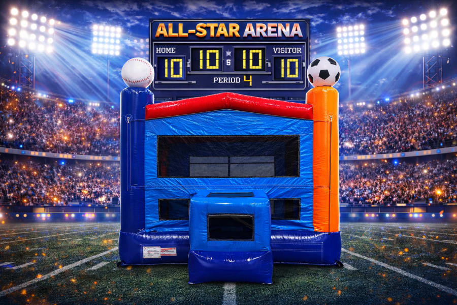 The All-Star Arena bounce house rental brings a full lineup of sports excitement to parties and events across Clarksville, TN. Featuring bold red and blue colors with oversized baseball, soccer ball, basketball, and football accents on each top corner, this inflatable is perfect for sports-themed birthday parties and team celebrations. Inside, kids can jump and compete in a spacious bounce area that even includes an inflated basketball hoop for added interactive fun. Mesh siding surrounds the unit for easy supervision, making it a safe and parent-friendly option for backyard parties, school field days, and church events throughout the Clarksville area. The all-sports design makes it a standout choice for little league teams, football parties, and basketball fans alike. As with all of our inflatable rentals, the All-Star Arena is thoroughly cleaned and sanitized before every delivery, and our team handles full setup and takedown for a stress-free bounce house rental experience in Clarksville.