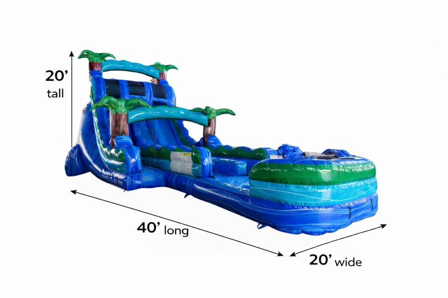 If you’re looking to crank up the fun in Clarksville, the Crazy Palms water slide rental brings tropical vibes and high-speed thrills to any event. Standing tall with eye-catching palm tree accents and bold blue and green colors, Crazy Palms instantly turns an ordinary backyard into a full-blown island adventure right here in Clarksville. Riders climb to the top, choose a lane, and race side-by-side down the dual slides before splashing into a refreshing pool that’s approximately 12–16 inches deep — the perfect cool-down on hot Tennessee days.