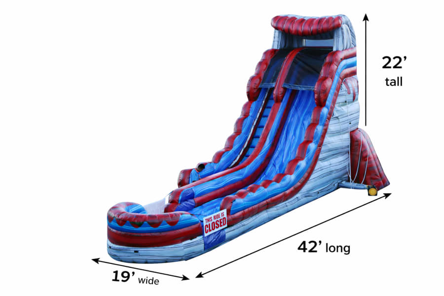 The bold red and blue color scheme gives AfterBurner a high-performance look that instantly becomes the centerpiece of any event in Clarksville. It’s the kind of slide that draws attention before anyone even climbs the ladder. Run AfterBurner wet for full-throttle splash action, or set it up dry using our special slide treatment that keeps the lane slick and lightning-fast without water.